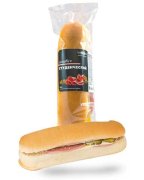 Багет из пшеничной муки в/с, рулет из птицы в/к, фирменный соус, сыр, огурец консервированный, капуста пекинская.